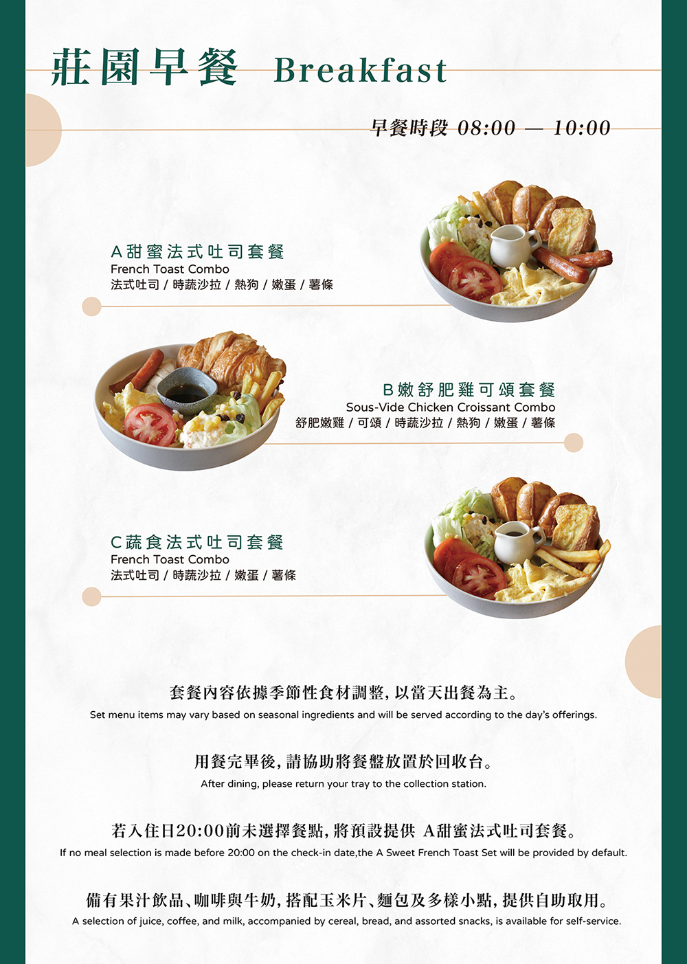 ● 若入住日20:00前未選擇餐點,將預設提供 A. 甜蜜法式吐司套餐。